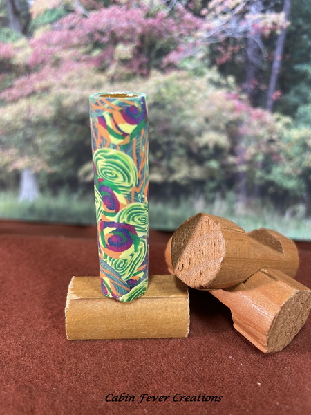 Blanks are made by “slicing” individual pieces of polymer clay canes and arranging on a designated tube.